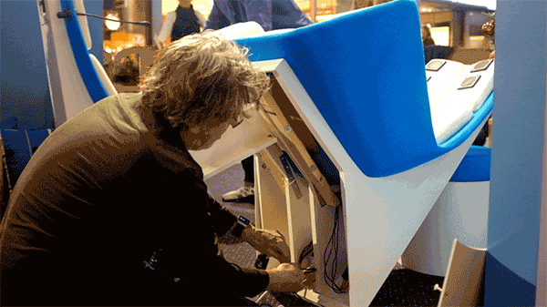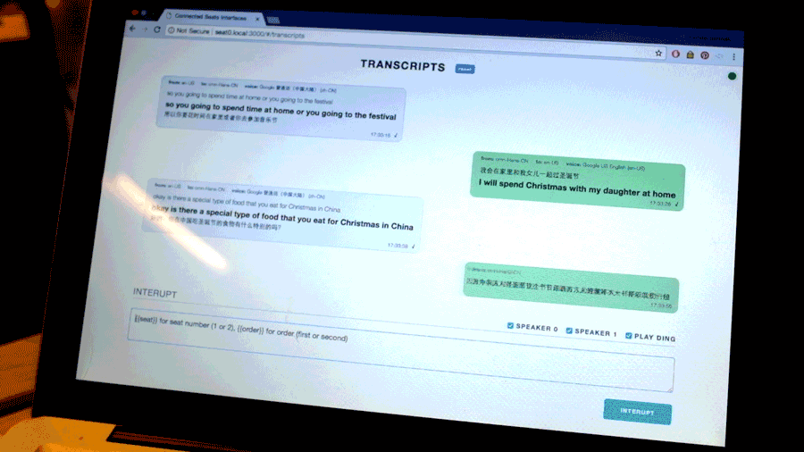 The seats were specially designed for travellers at Amsterdam Airport Schiphol. The translations worked with Google's Cloud Speech API, Translation API and Web Speech API.